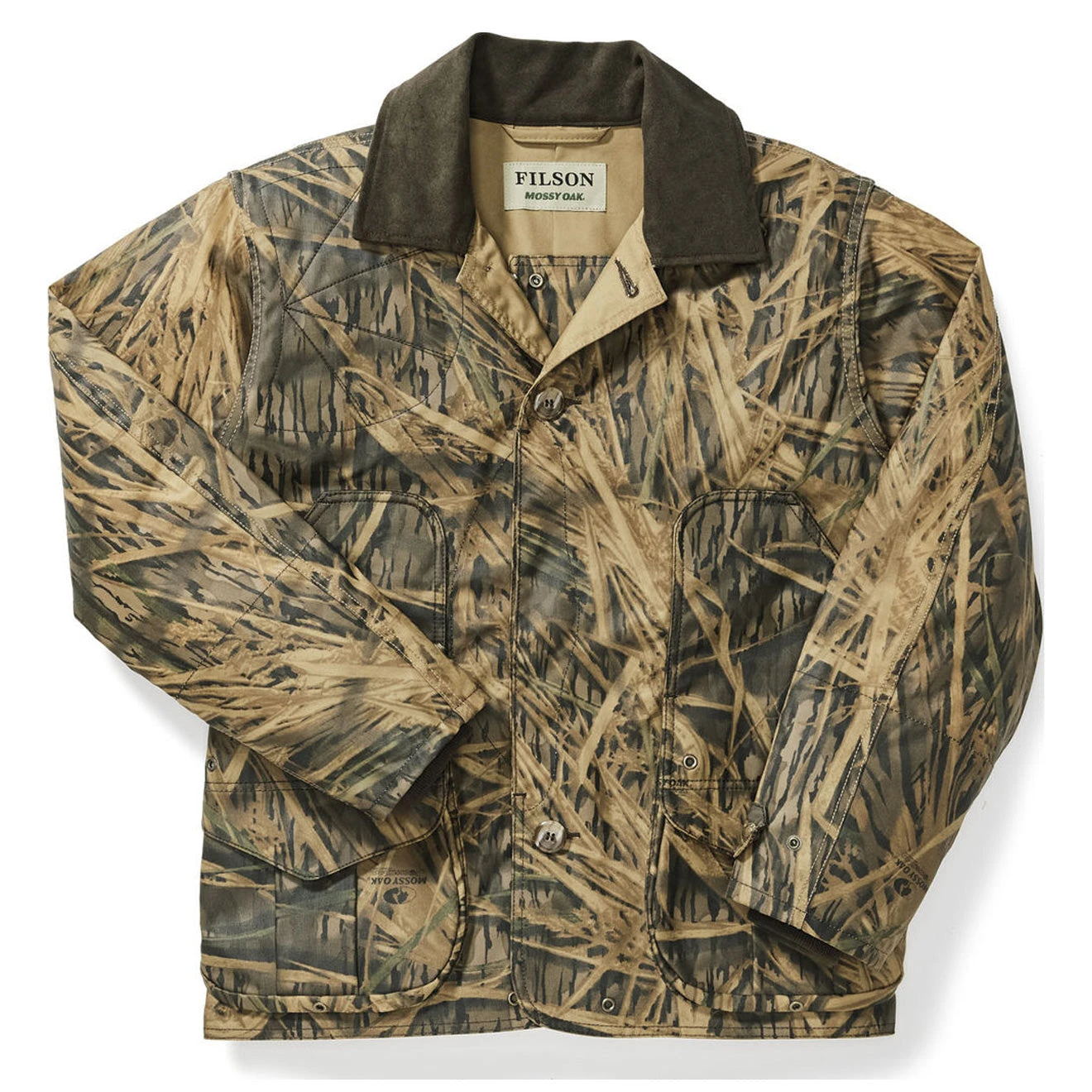 The Shelter Waterfowl Upland Coat is the ideal hunting coat, as it repels water, is durable, and has front-load game pockets that are blood-proof. Â The design of the jacket allows for a full range of motion while hunting, while the cuffs are fitted to retain body heat. Â A sueded, Moleskin-lined collar provides extra warmth and insulation against wind and rain.