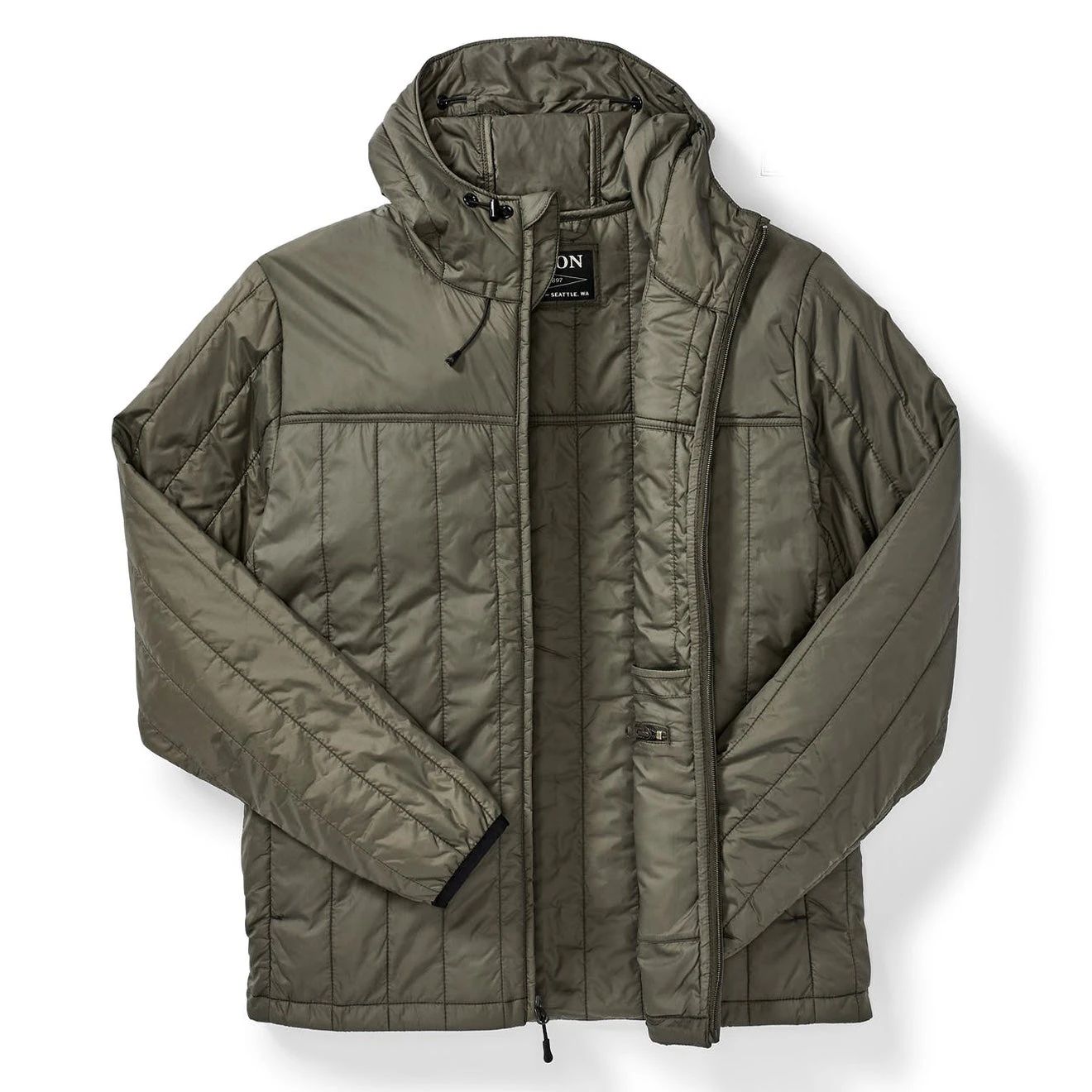 Made with a 1.5-oz. Cordura® ripstop nylon shell and insulated with 60g PrimaLoft® Gold, the Filson Ultra-Light Hooded Jacket is highly packable and surprisingly warm—made to be worn solo or as an insulating mid-layer in colder temperatures. Because PrimaLoft® Gold retains 98% of its warmth when wet, it boasts unmatched versatility in any weather. The full-length zipper has a zipper garage, so it’s comfortable when zipped all the way to the chin. The elastic cuffs and drawcord-adjustable hood and hem ensure a snug fit that seals in warmth, and zippered, Moleskin-lined handwarmer pockets add even more warmth and comfort. Features an interior zippered security pocket and a double layer of fabric over the yoke for durability.