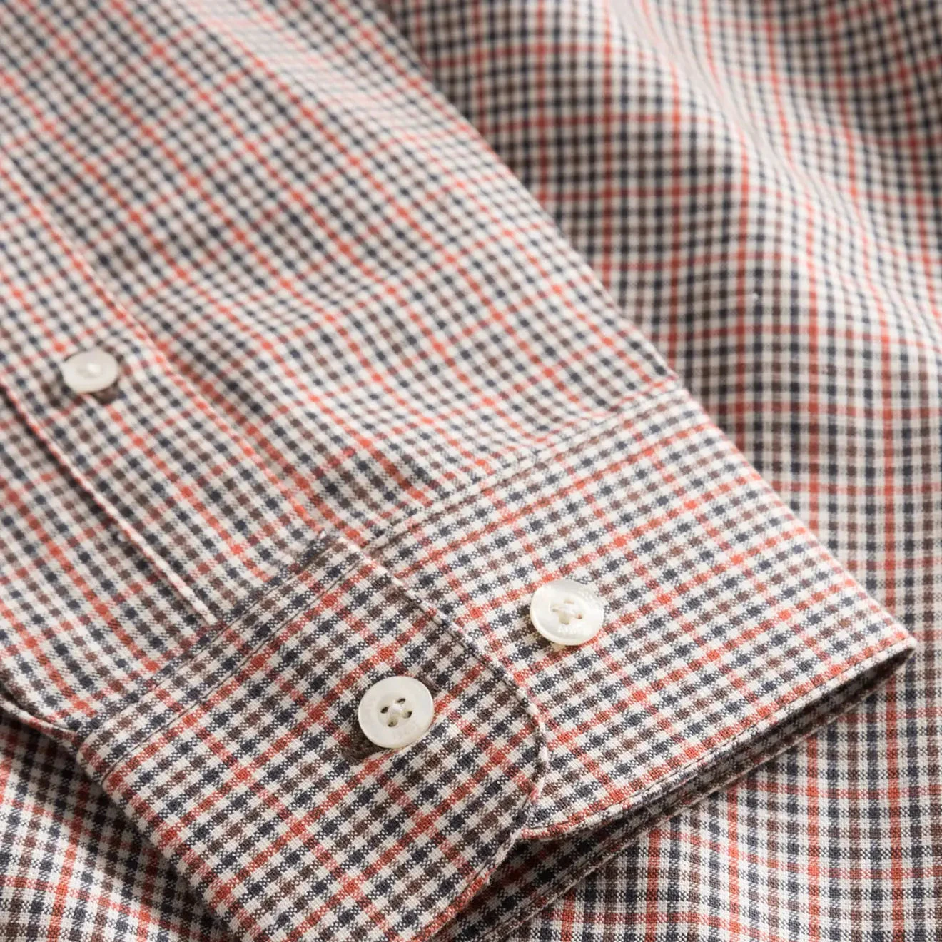 The Forét Mace Shirt features a delicate navy and brown checked pattern cut to a traditional shape finished with cream mother of pearl-look buttons.