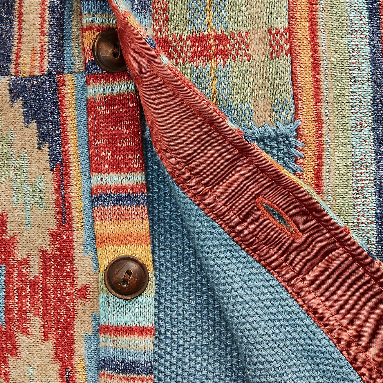Workshirt jumper knit using a birdseye-jacquard technique. Composed of a linen, cotton and wool blend. Constructed from approximately 50 patches featuring 12 different patterns. Inspired by vintage blankets from the ’30s and ’40s. Corozo buttons. Washed for a vintage look.