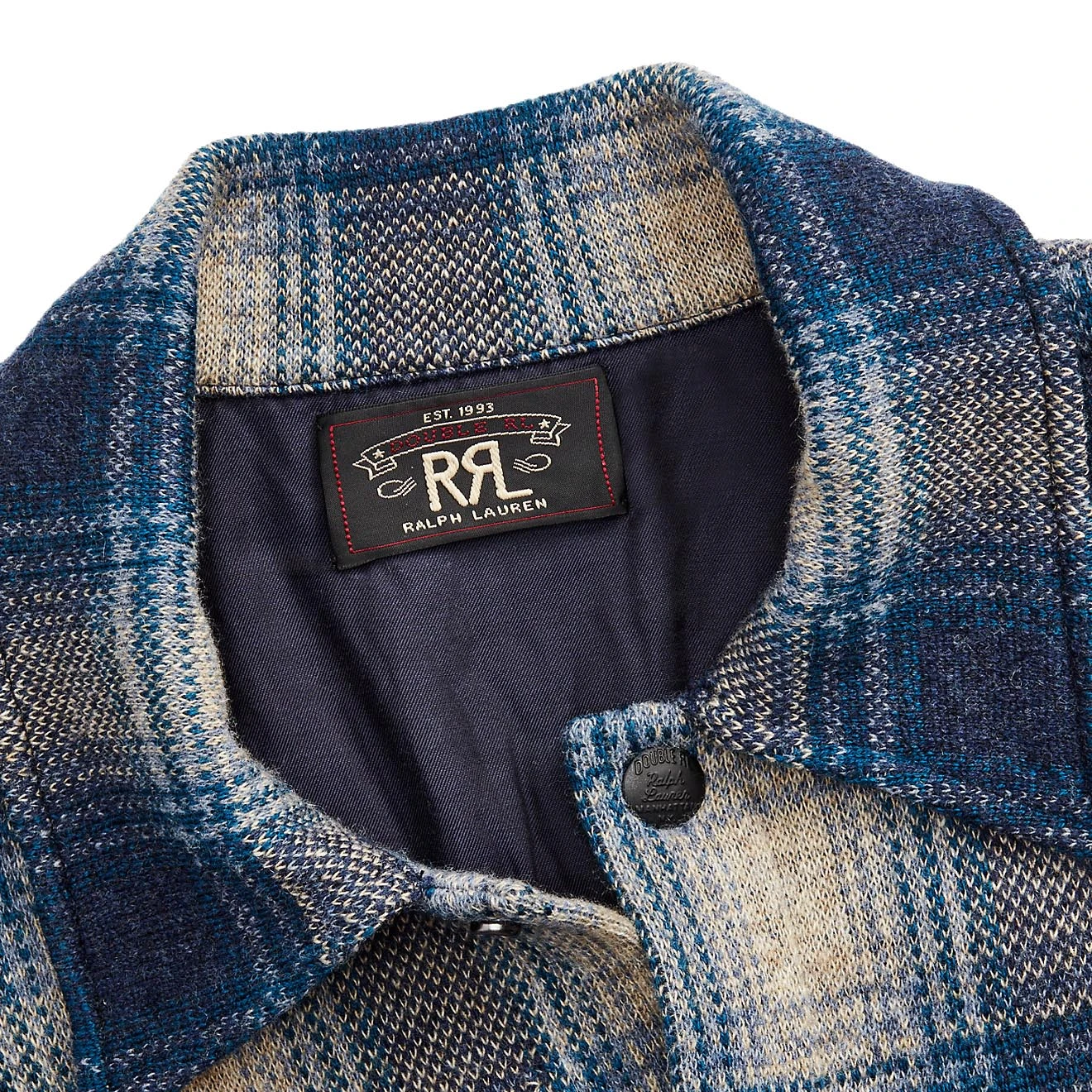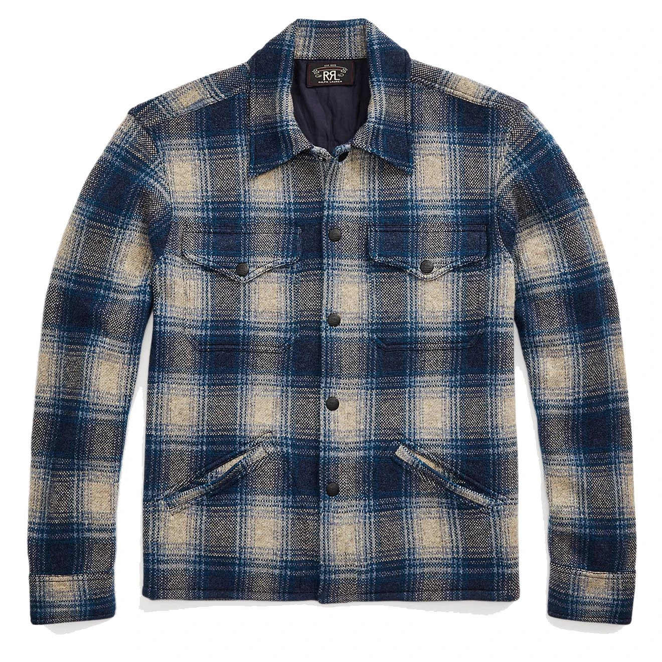 Workshirt jumper knit with wool and cashmere to create an ombré plaid pattern. Inspired by a 1940s garment. Twill reinforcements in the interior.