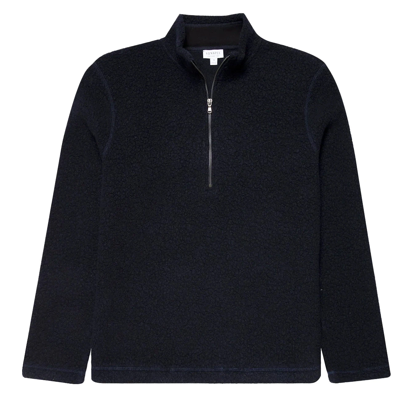 An elevated take on a classic half zip fleece, the Sunspel Wool Fleece Zip Neck will add a touch of luxury to any outfit. Crafted from an exceptionally soft Italian recycled wool which comes from both pre and post use fabric and then combined with polyester for extra durability. Constructed with a jersey lined inside collar, a YKK half zip and a YKK chest pocket with a zip fastening. An elevated essential.